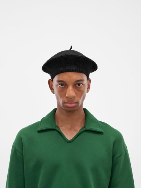 A black crochet beret in merino wool with a ribbed opening and cabillou detail at the top. The stretch fit offers comfortable seasonal wear. Featuring: • Stretch fit • Crochet merino wool knit construction • Cabillou at top • Ribbed opening • Made in Peru • 100% Merino wool • One size