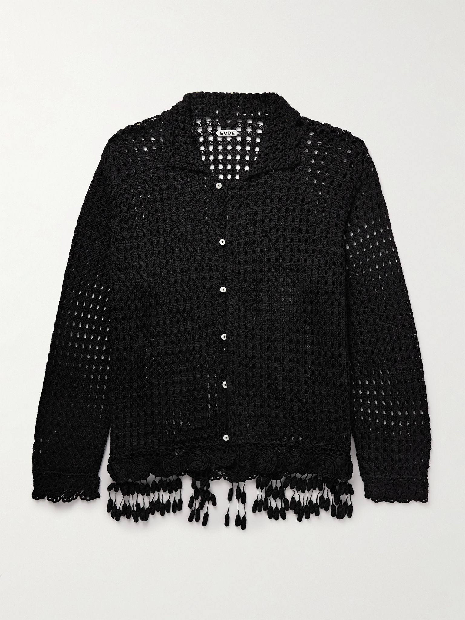 BODE's clothing often references decades past - this 'Blossom' shirt is modelled on a cap from the 1920s. It's made from crocheted Pima cotton and trimmed with swishy tassels along the hem. Size & Fit - Fits true to size. Take your normal size - Designed for a regular fit - Mid-weight, open knit - Model is shown wearing a M - Model measures: chest 38"/ 96cm, height 6'1"/ 185cm Details & Care - Black Pima cotton - Button fastenings - 100% Pima cotton - Dry clean - Mother-of-pearl: USA