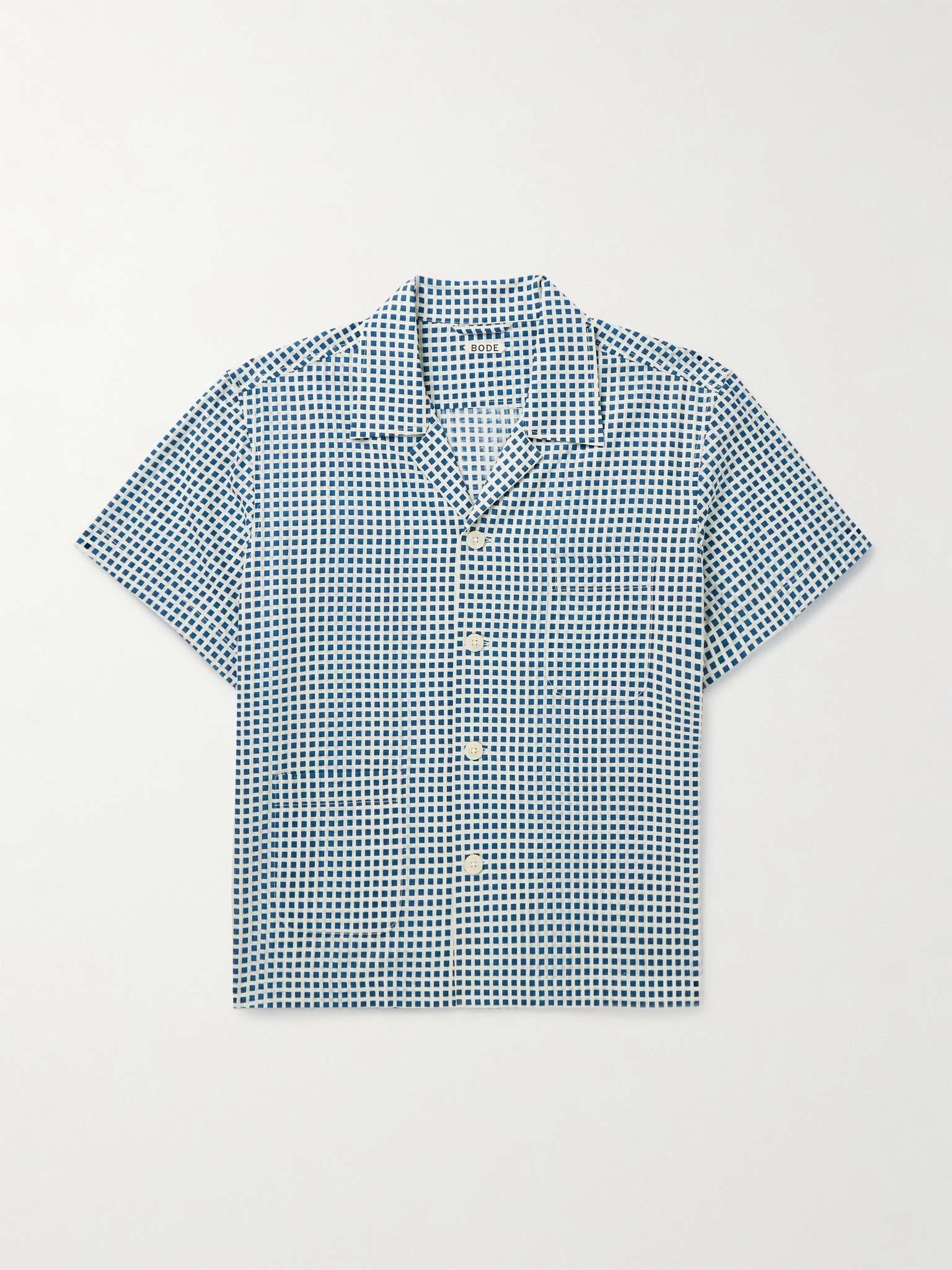 All of BODE's designs are influenced by retro styles. This 'Hyannis' camp-collar shirt is made from cotton-voile and printed with a cool grid pattern from a 1930s dress. Size & Fit - Fits true to size. Take your normal size - Designed for a boxy fit - Lightweight, non-stretchy fabric - Model is shown wearing a M - Model measures: chest 38"/ 96cm, height 6'1"/ 185cm Details & Care - White and blue cotton-voile - Button fastenings - 100% cotton - Dry clean