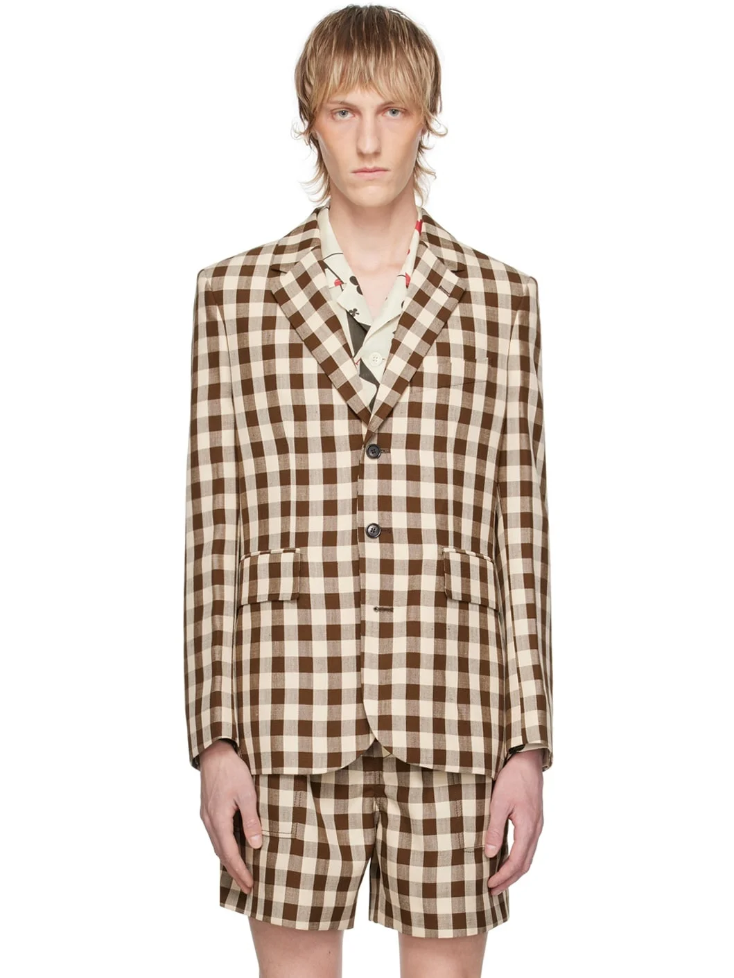 Plain-woven viscose blazer. Jacquard check pattern throughout. · Notched lapel · Single-breasted three-button closure · Welt pocket and flap pockets · Padded shoulders · Four-button surgeon's cuffs · Twin vents at back hem · Locker loop at inner collar · Welt pockets at interior · Full viscose satin lining This item is part of a limited run of 30. Supplier color: Brown/White Body: 100% viscose. Lining: 100% viscose. Made in Romania 242169M195004