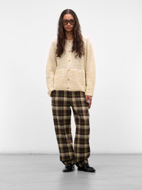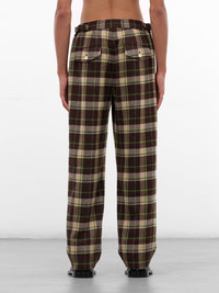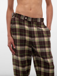 Brown wool trousers with a tailored plaid pattern. The cinch straps and straight-leg cut create a refined, tailored cut with a vintage pattern. Featuring: • Relaxed fit • Wool construction • Plaid pattern • Mid waist • Front button and zip fly closure • Side cinch straps • Side seam and back flap pockets • Straight leg • Made in Portugal • 100% Wool • Standard sizing Model is 5'11.5" wearing size 32. Shoulders: 18" Chest: 36" Waist: 30"