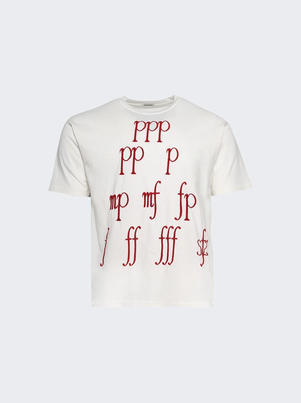 Details - Short sleeve t-shirt - Embroidery inspired by vintage music theory flashcards - Mnemonic device printed on the back - Material: 100% Cotton Size Information: Vendor Color Code: Brand Style: MRF25CS030 Designer/Brand: BODE