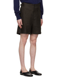 Plain-woven linen shorts. · Adjustable cinch tabs at waistband · Two-pocket styling · Button-fly · Darts at back waistband This item is part of a limited run of 51. Supplier color: Brown black 100% linen. Made in Romania 251169M193008