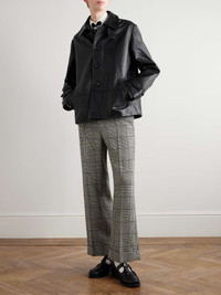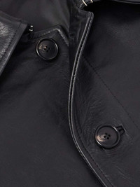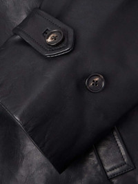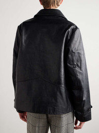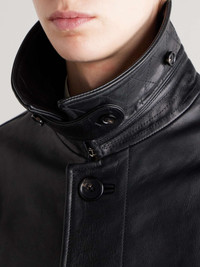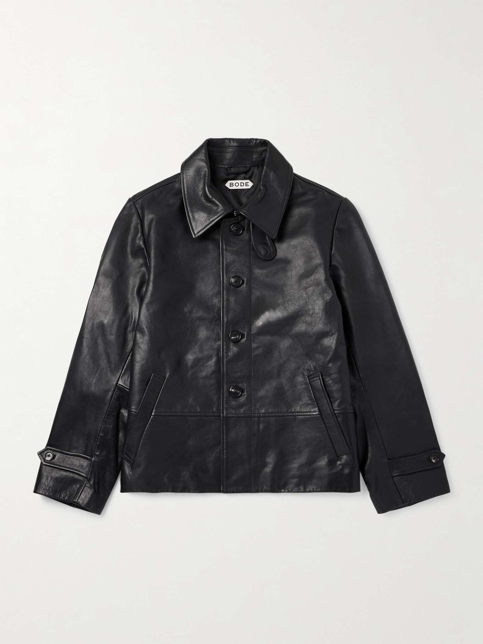 BODE drew inspiration from World War I aviator uniforms when designing this jacket. Made from soft leather in a slightly cropped, boxy fit, it has buttoned tabs at the cuffs and a throat latch, so you can wear the collar standing to shield your neck. Another cool detail is the dropped, pointed yoke. Size & Fit - Model wears a size larger to achieve a looser fit - Structured, non-stretchy leather - Model is shown wearing a M - Model measures: chest 36"/ 92cm, height 6'2"/ 188cm Details & Care - Black leather - Button fastenings - 100% leather (Cow) - Specialist clean