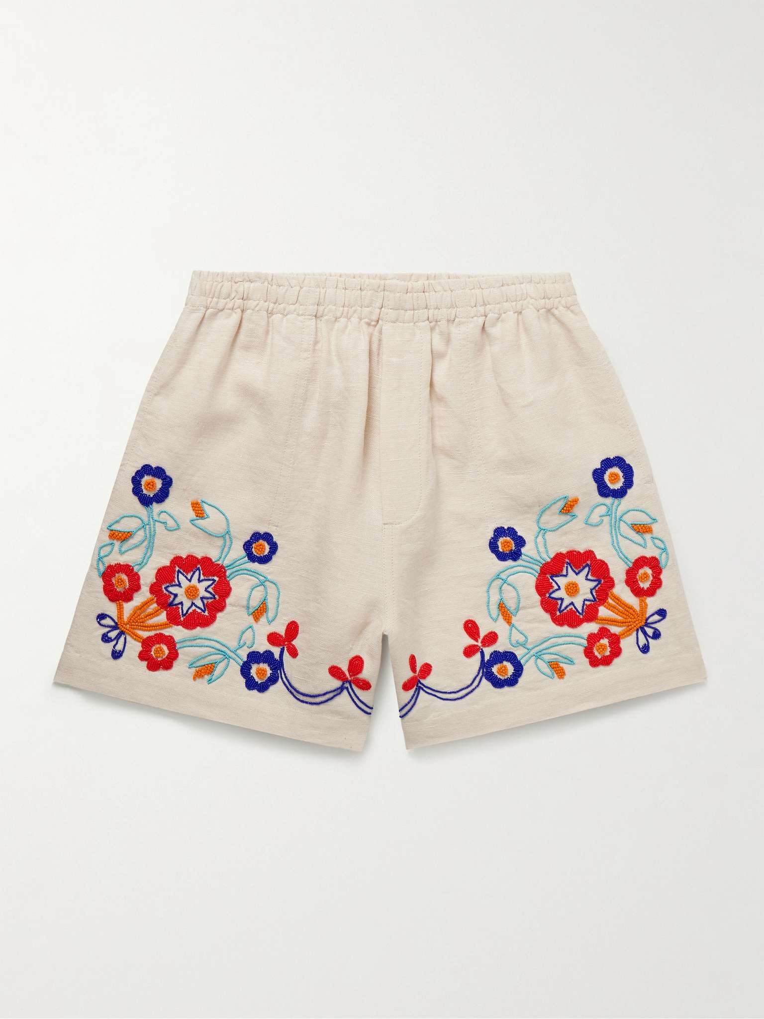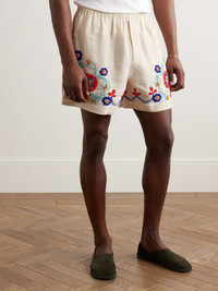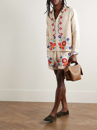 BODE's 'Garden Party' shorts are named for the intricately beaded flowers across the front and back. They're cut for a roomy fit from breathable linen and have an elasticated drawstring waistband and functional zipped fly. Wear them with the matching shirt. Size & Fit - Fits true to size. Take your normal size - Regular-straight leg, low-crotch style - Internal drawstring at the waist - Mid-weight, non-stretchy fabric - Model is shown wearing a M - Model measures: waist size 32, height 6'2"/ 188cm Details & Care - Cream linen - 100% linen - Dry clean