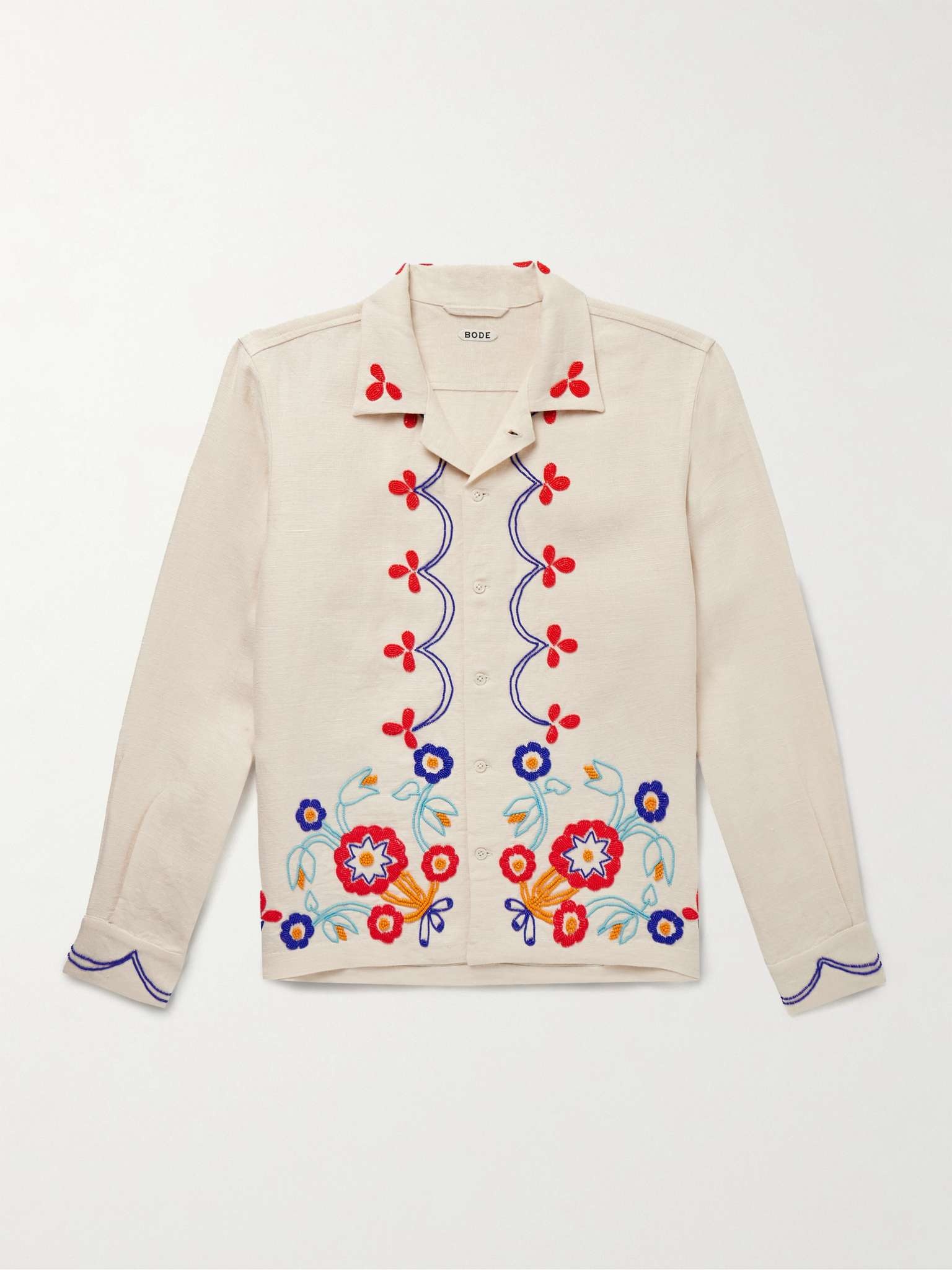 BODE's 'Garden Party' shirt is adorned with colourful beads arranged in a floral pattern. It’s cut from breathable linen and has a relaxed camp collar. Complete the look with the matching shorts. Size & Fit - Those who are above 6'1"/ 185cm may wish to take the next size up - Designed for a boxy fit - Mid-weight, non-stretchy fabric - Model is shown wearing a L - Model measures: chest 38"/ 96cm, height 6'2"/ 188cm Details & Care - Cream linen - Button fastenings - 100% linen - Dry clean