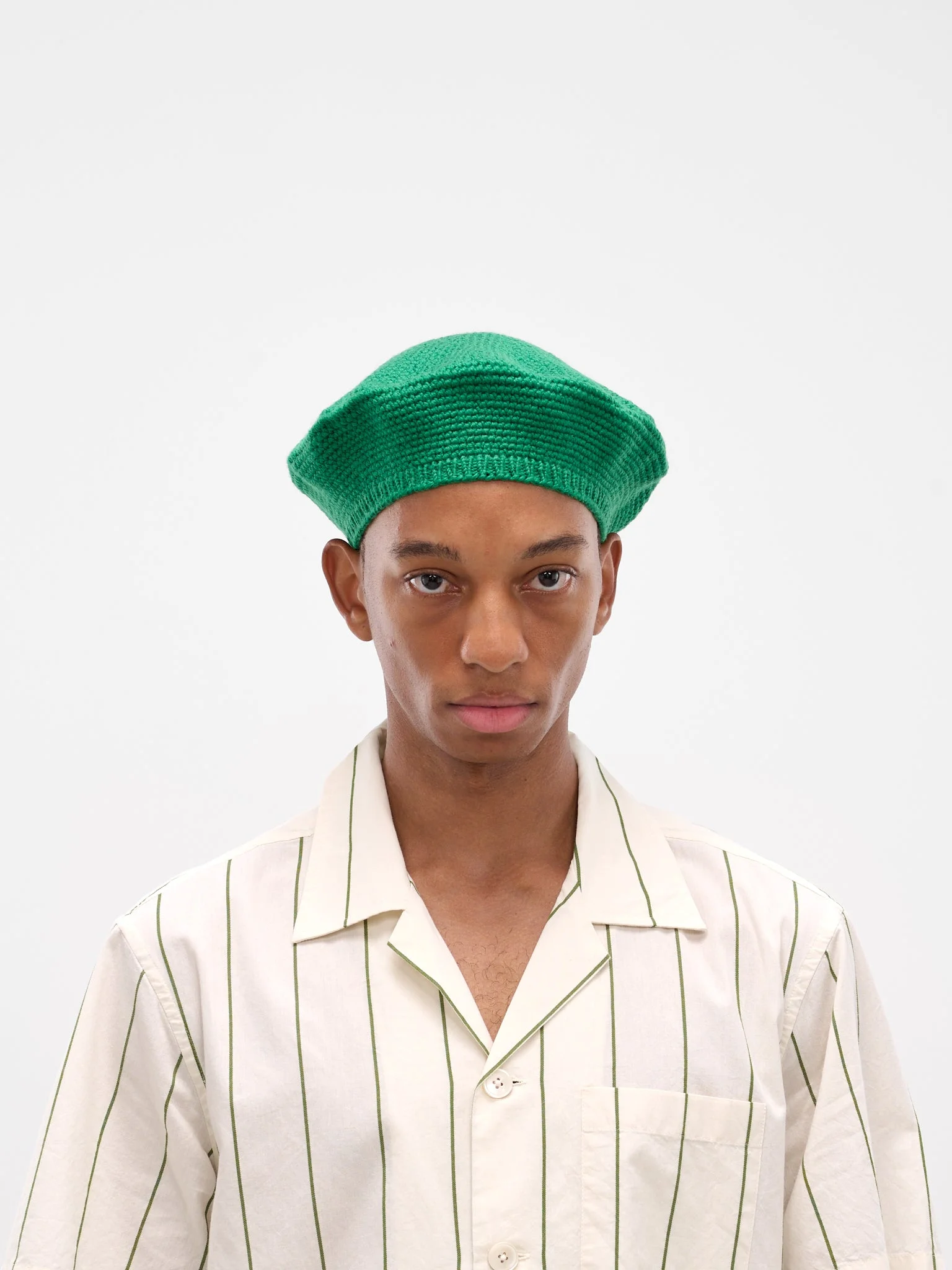 A green crochet beret in merino wool with a ribbed opening and cabillou detail at the top. The stretch fit offers comfortable seasonal wear. Featuring: • Stretch fit • Crochet merino wool knit construction • Cabillou at top • Ribbed opening • Made in Peru • 100% Merino wool • One size