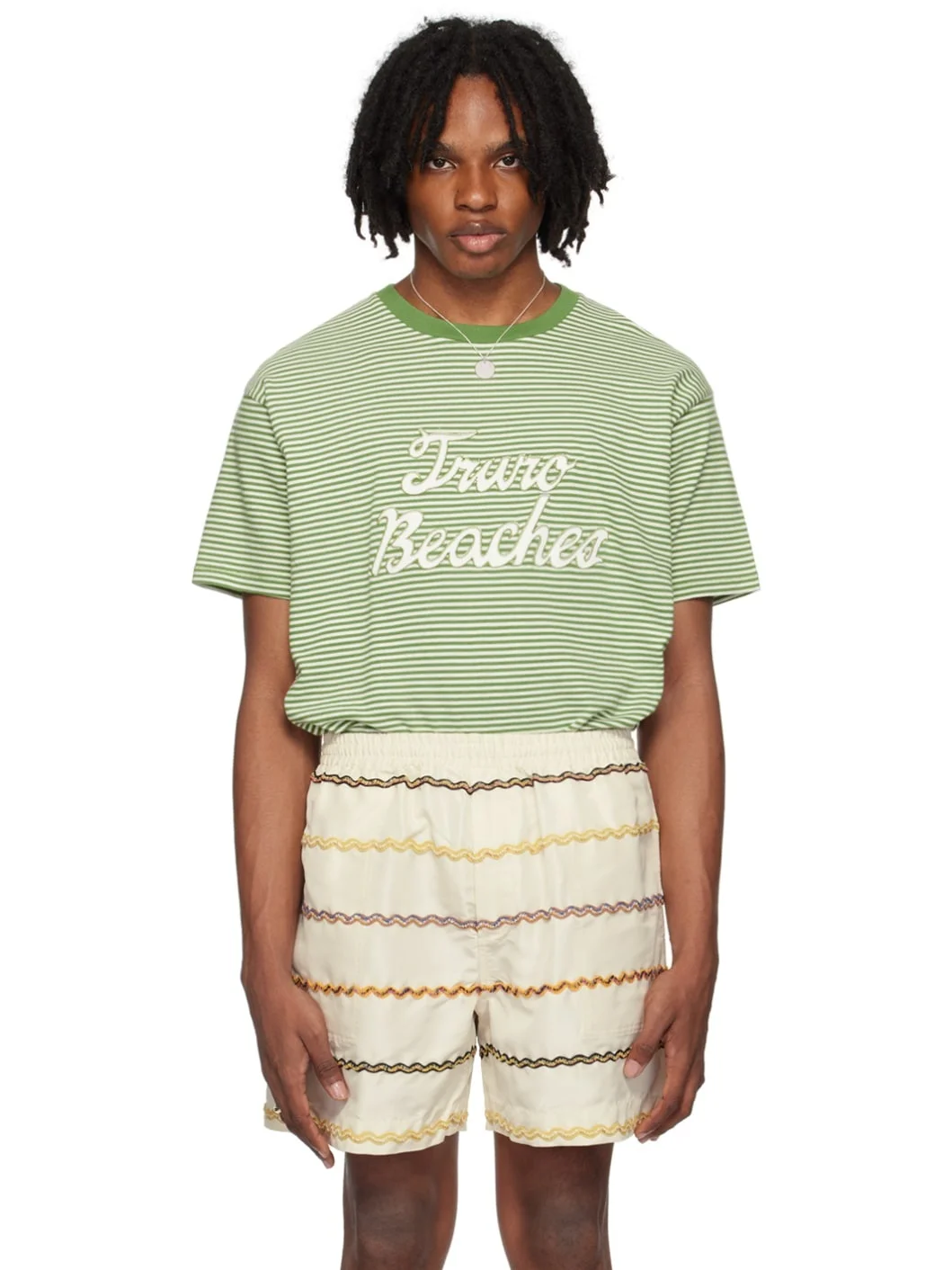 Cotton jersey T-shirt. Stripes throughout. · Rib knit crewneck · Text appliques at front · Dropped shoulders This item is part of a limited run of 64. Supplier color: Green/Cream 100% cotton. Made in Portugal 242169M213004