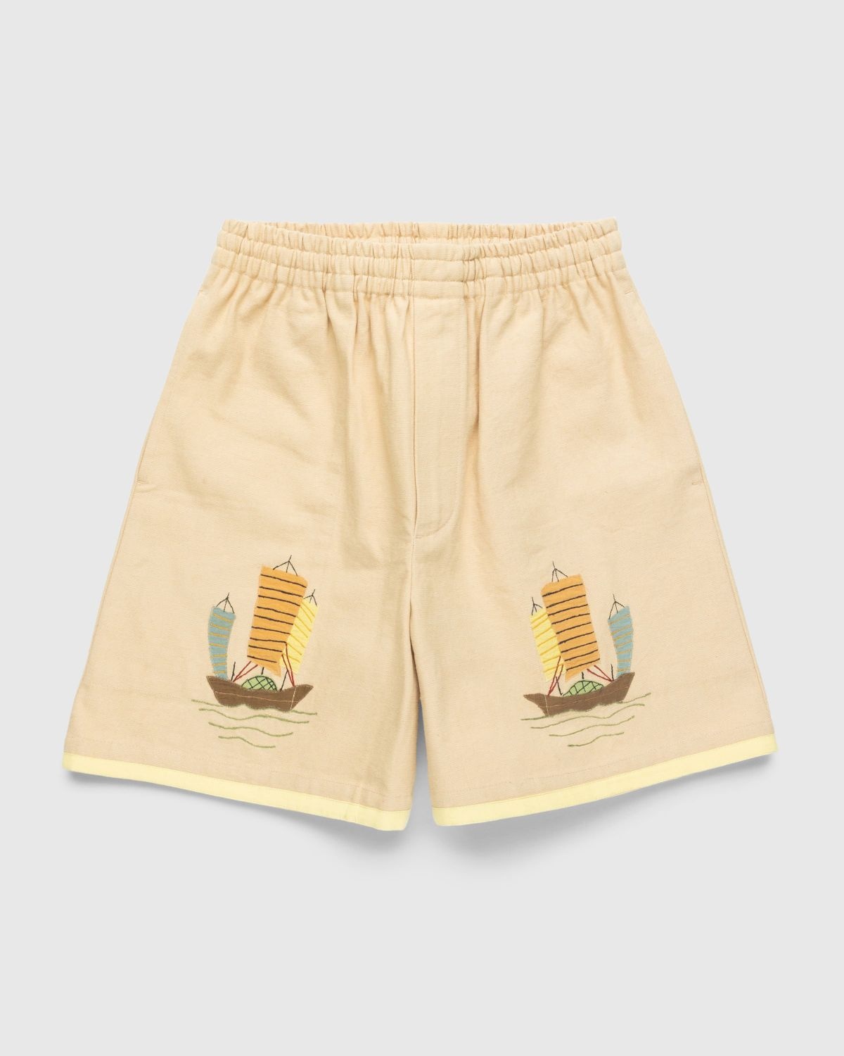 These Bode shorts are a reproduction of a souvenir bag from the 1930s-1950s, featuring contrasting tape and the original ship applique. The silhouette is cut to mimic traditional rugby shorts, featuring a short inseam and wide leg opening. Details include an elastic waist and pockets incorporated at the side seams and back. Size & Fit Regular fit with a short inseam and wide leg opening. Product Details 55% linen. 45% cotton. Contrasting tape. Ship applique at the front. Elastic waist. Side seam pockets. One back pocket.