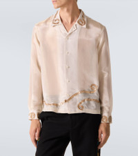 With the sole mission of telling stories through fashion, Bode creates nostalgic styles using historical techniques and vintage patterns. The Lido semi-sheer shirt is enriched with lame appliques inspired by a 1930s costume dress. Product Details - Material: 100% viscose - Care instructions: dry clean - Made in India - Designer color name: Antique Gold - Item color: white, gold - Collar: classic (Straight point) - Closure: buttoned front - Cuff: buttoned - Item number: P01049139 Size & Fit - True to size - With pleats in the back - Semi-sheer - Straight fit - Non-stretchy fabric - Falls to the hip - Height of model is 189cm-74.5" and wears a size L