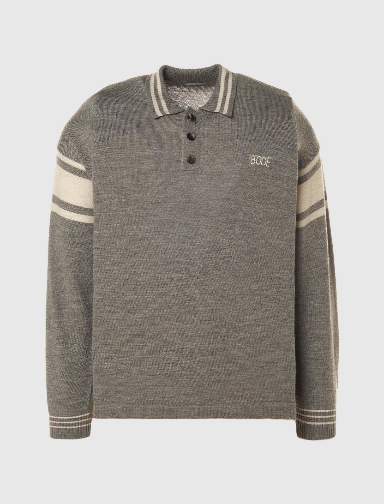 Regular-fit wool polo sweater. Ribbed striped collar and cuffs. Embroidered logo text at chest. Stripes at sleeves. Button closures at front. - 100% Wool SKU: MRF23KT035