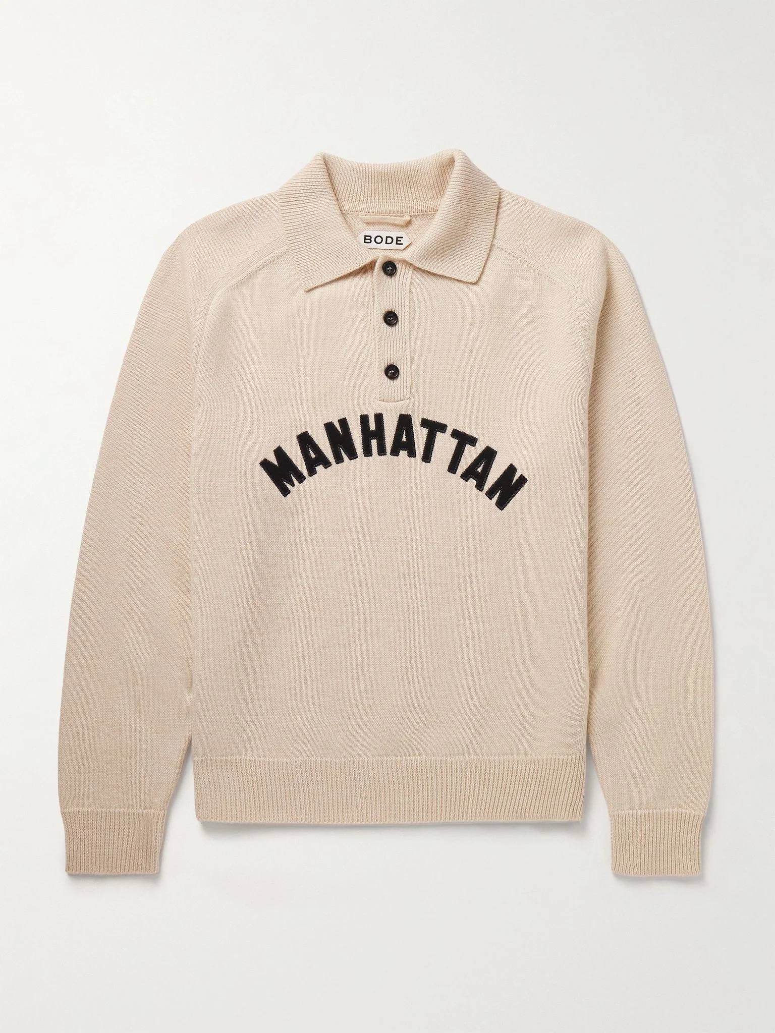 BODE's wool shirt is modelled on basketball uniforms from the '20s - note the appliqued letters that spell out 'Manhattan'. It's has a cool, slouchy shape and a relaxed polo collar. Size & Fit - Fits true to size. Take your normal size - Designed for a regular fit - Mid-weight knit - Model is shown wearing a M - Model measures: chest 38"/ 96cm, height 6'1"/ 185cm Details & Care - Cream wool - Button fastenings - 100% wool; buttons: 100% horn (Buffalo) - Dry clean