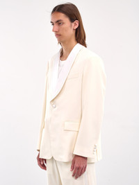 BODE jacket in white, blazer design, paneled wool construction, shawl collar, v-neckline, structured shoulders, long sleeves, surgeon's cuffs, front button closure, chest welt pocket, side welted flap pockets, back vent & tacking stitch, straight hem, tailored fit. Made in Romania 100% Wool Italian Sizing Model is 6'2" wearing size 46. Shoulders: 19" Chest: 38" Waist: 29"