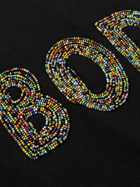 Inspired by playful children's clothing from the '60s, BODE's T-shirt is threaded with rainbow beads that spell out the brand's moniker. It's cut from black cotton-jersey and has a relaxed, boxy shape. Size & Fit - Model wears a size larger to achieve a looser fit - Mid-weight, stretchy fabric - Model is shown wearing a M - Model measures: chest 36"/ 92cm, height 6'1"/ 185cm Details & Care - Black cotton-jersey - 100% cotton - Machine wash