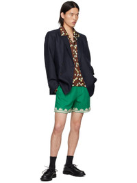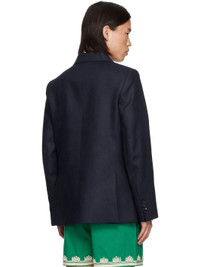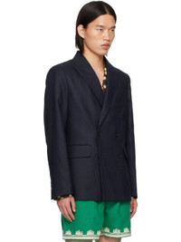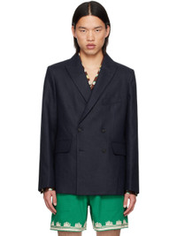 Linen hopsack blazer. · Peaked lapel · Double-breasted button closure · Welt pocket at chest · Flap pockets · Padded shoulders · Four-button surgeon's cuffs · Vents at back hem · Welt pockets at interior · Full viscose satin lining This item is part of a limited run of 52. Supplier color: Midnight Body: 100% linen. Lining: 100% viscose. Made in Romania 242169M195005
