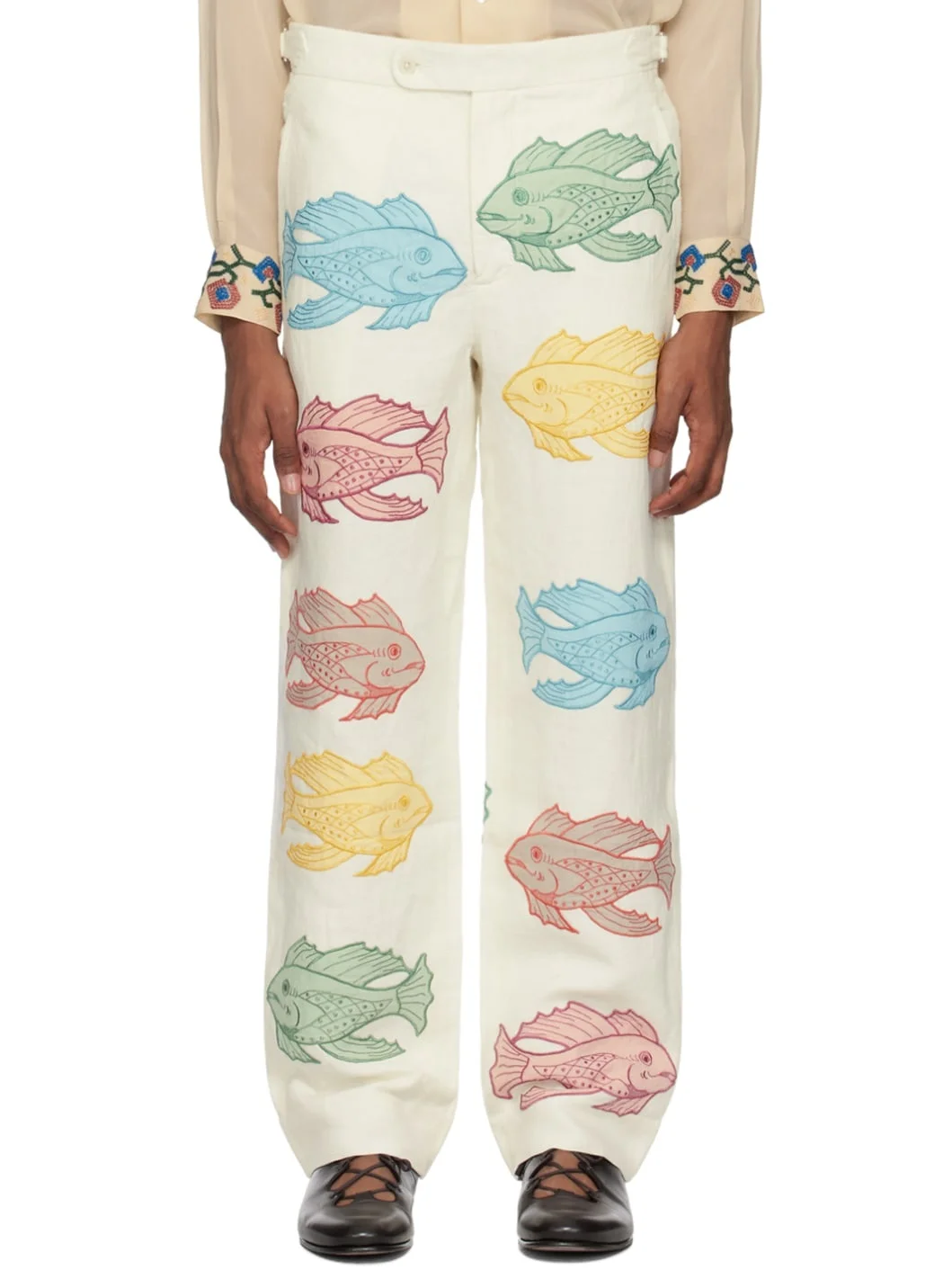 Straight-leg linen canvas trousers. Embroidered graphic appliques throughout. · Cinch tabs at waistband · Four-pocket styling · Zip-fly · Full plain-woven cotton lining This item is part of a limited run of 60. Supplier color: White/Multi Body: 100% linen. Lining: 100% cotton. Made in India 242169M191006