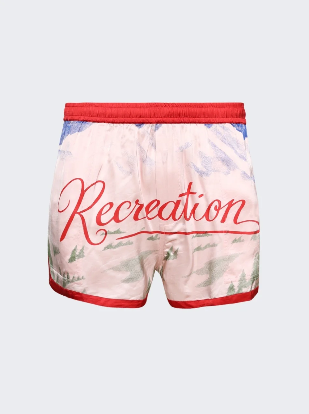 Details - Gym shorts inspired by a vintage woven label - Snowy mountain graphic printed by hand, with variations throughout - Model is 6'1"/185cm and is wearing a size M - Material: 56% viscose, 44% modal Brand Style: MRS25BT040 Designer/Brand: BODE