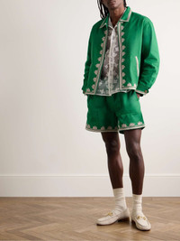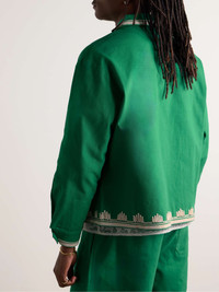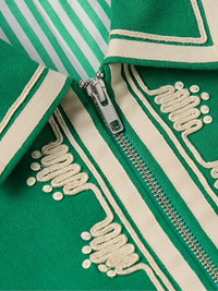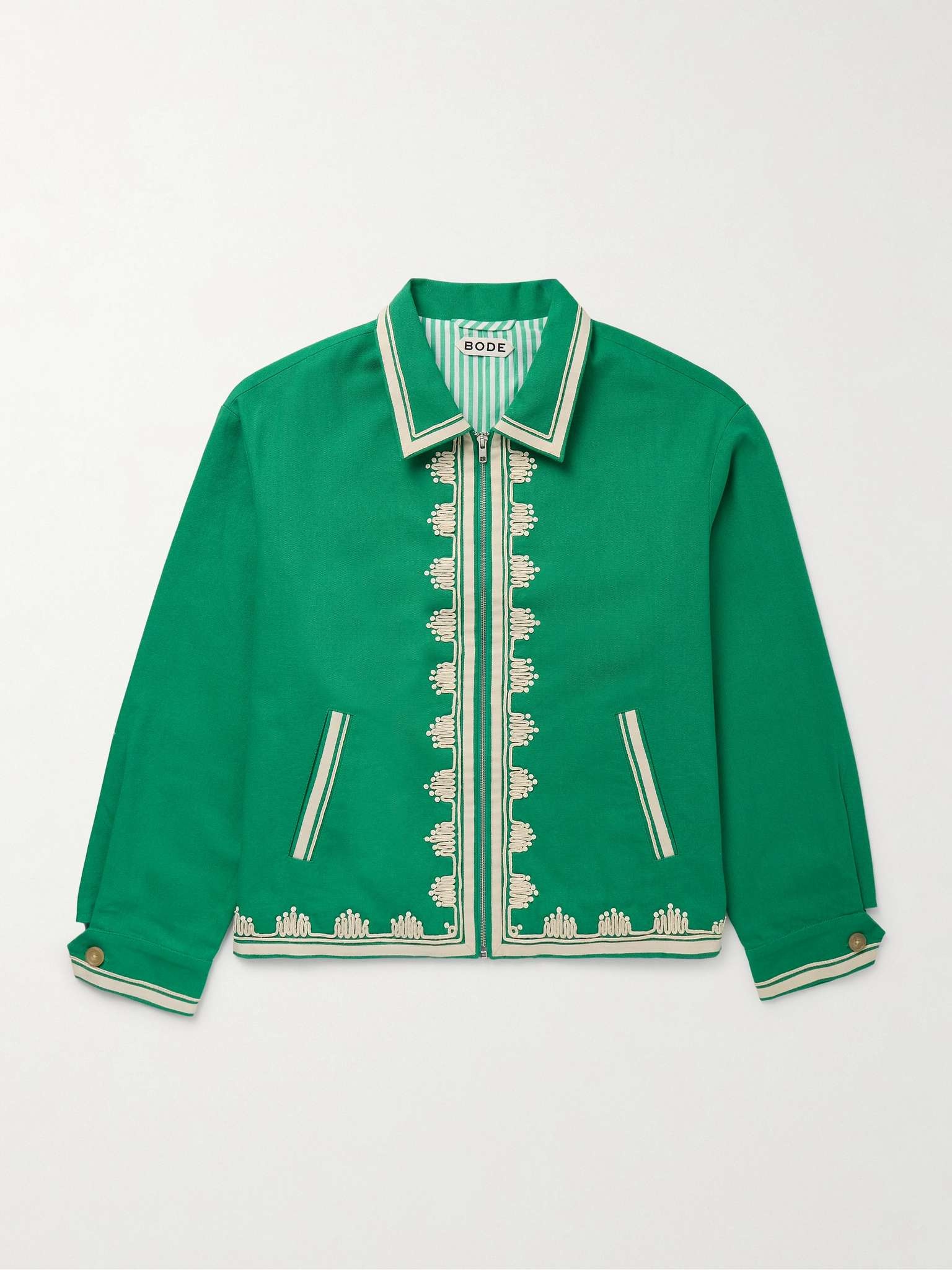 BODE's jacket is inspired a vintage children's style from the 1930s. Made from vibrant jade cotton-canvas, it's detailed with grosgrain and intricate hand-embroidered trims, each one tipped with a tonal sequin. Complete the set with the matching shorts. Size & Fit - Model wears a size larger to achieve a looser fit - Mid-weight, non-stretchy fabric - Model is shown wearing a L - Model measures: chest 38"/ 96cm, height 6'2"/ 182cm Details & Care - Jade cotton-canvas, ecru grosgrain - Zip fastening - 100% cotton - Dry clean