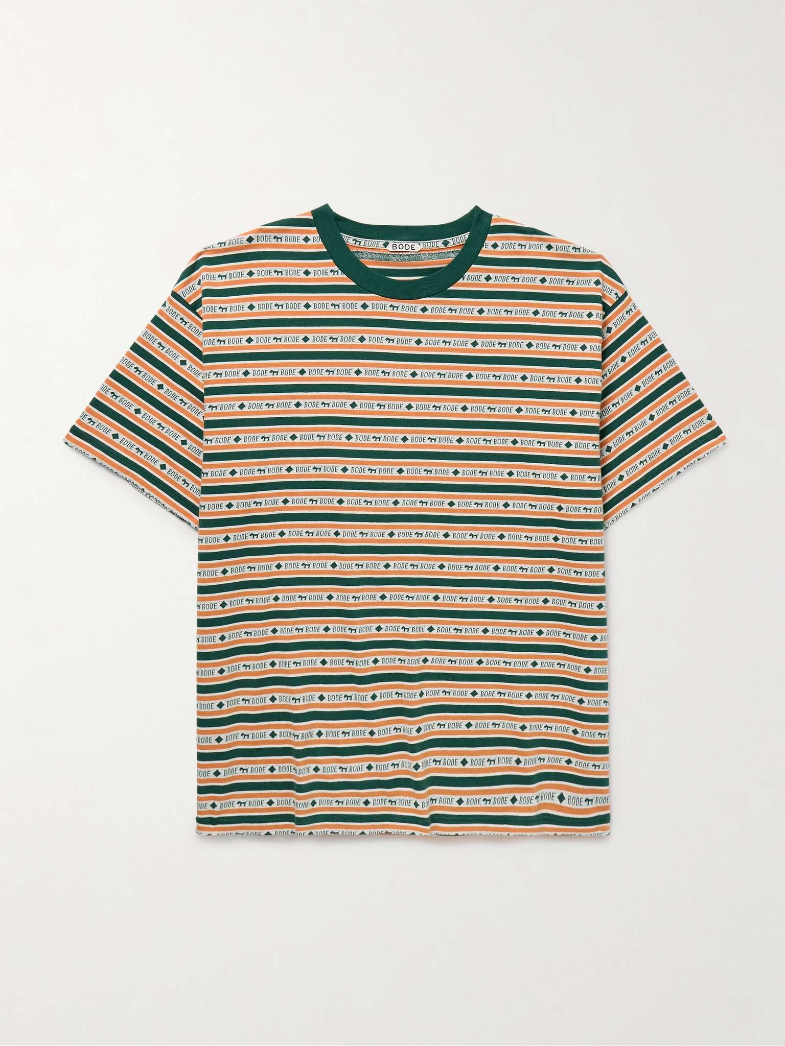 BODE's T-shirt is jacquard-knitted with the logo and 'Scottie' dog motifs - the latter is inspired by founder Emily Adams Bode Aujla's mother's collection of Scottish Terrier trinkets. It's made from soft cotton and has colourful slim stripes. Size & Fit - Fits true to size. Take your normal size - Designed for a relaxed fit - Mid-weight, stretchy fabric - Model is shown wearing a M - Model measures: chest 38"/ 96cm, height 6'2"/ 188cm Details & Care - Emerald, white and orange cotton-jacquard - 100% cotton - Machine wash