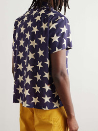 For AW24, BODE breathes new life into quintessential Americana and interprets familiar motifs in fresh ways. This convertible-collar shirt is woven from lightweight cotton and printed with cream stars set against a blue ground. It's finished with the brand name embroidered in red threads at the back. Size & Fit - Fits true to size. Take your normal size - Designed for a regular fit - Slightly short in length - Lightweight, non-stretchy fabric - Model is shown wearing a M - Model measures: chest 38"/ 96cm, height 6'0"/ 183cm Details & Care - Navy and cream cotton - Button fastenings - 100% cotton - Dry clean