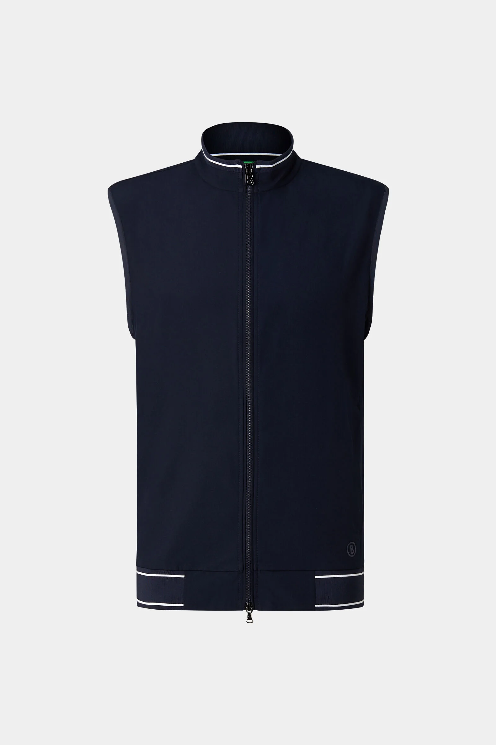 In lightweight 4-way stretch, the Mahdi functional vest is a comfortable addition to performance styling. The modern design is highlighted by the stand-up collar and ribbed waistband with striped details, complemented by concealed zip pockets. Subtle label details round off the piece harmoniously. Style number 262-8220-7268-464