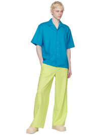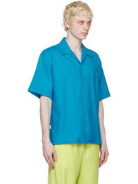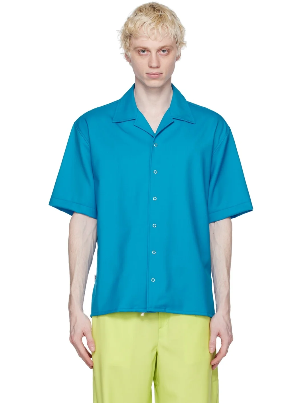 Stretch virgin wool twill shirt. · Open spread collar · Press-stud closure · Logo flag at side seam · Vented side seams · Dropped shoulders Supplier color: Azure 99% virgin wool, 1% elastane. Made in Italy 231945M192004
