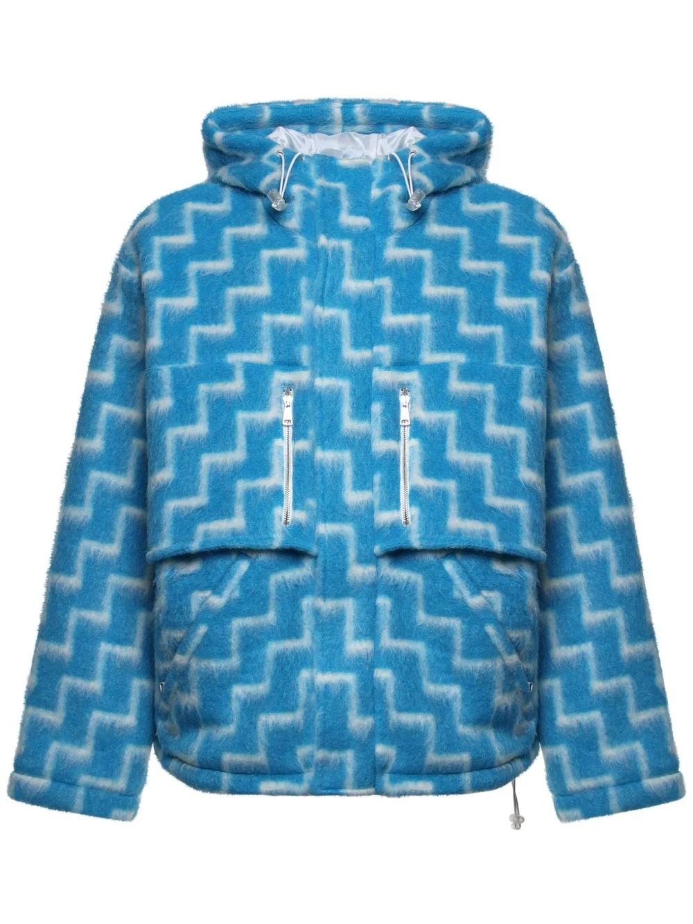 Scale jacket Highlights - Blue/white - Fleece texture - Concealed front fastening - Drawstring hood - Long sleeves - Two zip-fastening chest pockets - Two side slit pockets - Drawstring hem Made in Italy Composition Acrylic 31%, Polyester 28%, Mohair 24%, Virgin Wool 17%