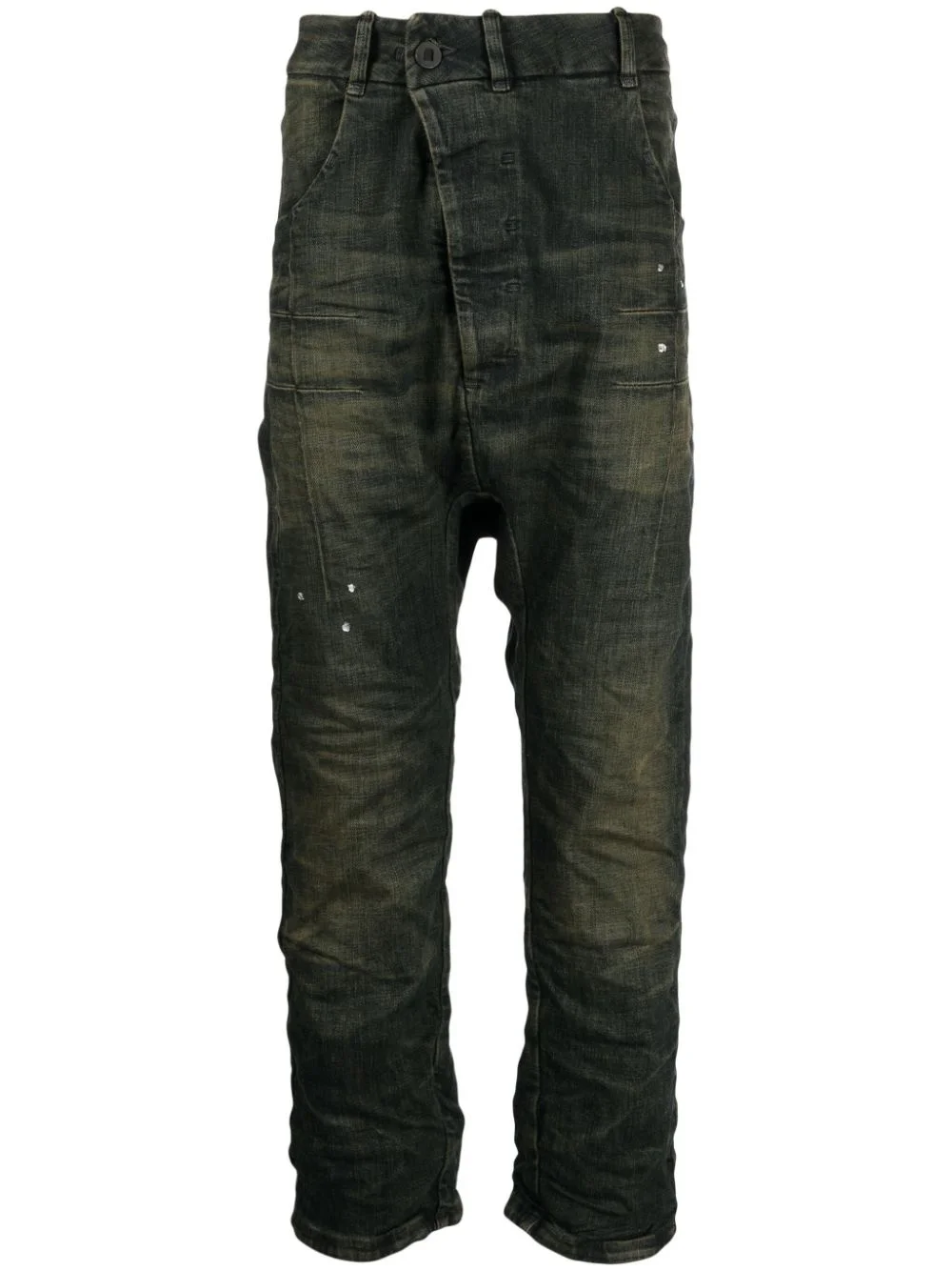 asymmetric drop-crotch jeans Highlights - Midnight blue - Cotton blend - Paint splatter detail - Bleached effect - High waist - Concealed front button fastening - Classic five pockets - Straight leg Imported Composition Body: Cotton 98%, Polyester 2% SIZE & FIT Model measurements Height 6 ft 2 in(1.89 m) Bust/Chest 37.4 in(95 cm) Hips 36.61 in(93 cm) Waist 28.34 in(72 cm) FittingInformation Designed with a straight leg, these jeans allow for an unrestricted and comfortable fit over the leg Sturdy and hard-wearing, this denim piece offers no stretch This piece fits true to size – take your usual size