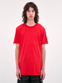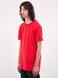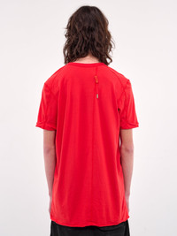 BORIS BIDJAN SABERI t-shirt in red, paneled cotton construction, object dyed, crewneck, back signature drawstring detailing, short sleeves, raw hems, straight hemline, relaxed fit. Made in Spain 100% Cotton Standard Sizing Model is 6'0" wearing size M. Shoulders: 18" Chest: 36" Waist: 30"