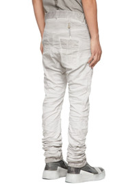 Skinny-fit resin-dyed vinyl-coated stretch denim jeans in grey. Gathering throughout. · Mid-rise · Dropped inseam · Fading and speckled pattern in white throughout · Four-pocket styling · Belt loops and concealed drawstring at waistband · Paneled front legs · Concealed elasticized ankle strap at cuffs · Signature drawstring with sterling silver aglet at back waistband · Offset button-fly · Antiqued black sterling silver hardware Each item is unique. Please note that coloration may vary. Supplier color: Faded light grey Body: 97% cotton, 3% lyocell. Trim: 925 sterling silver.