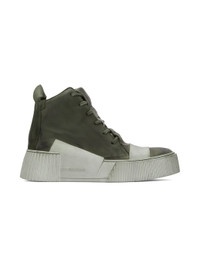 High-top grained horse leather high-top sneakers in khaki. Discoloration and distressing throughout. · Rubberized strap at vamp · Lace-up closure · Padded tongue and collar · Webbing pull-loop at heel collar · Vegetable-tanned calfskin lining · Textured and treaded rubber sole with logo embossed at outer side · Platform: H2 in Each item is unique. Please note that coloration may vary. Available exclusively at SSENSE. Supplier color: Military green Upper: horse leather. Sole: rubber.