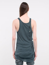 BORIS BIDJAN SABERI t-shirt in alga, tank top design, cotton-cashmere blend, paneled construction, scoop neck, shoulder straps, sleeveless, armscyes, asymmetric hem, longline, slim fit. Made in Spain 85% Cotton 15% Cashmere Standard Sizing Model is 5’11” wearing size M. Shoulders: 15” Chest: 17.5” Waist: 28”