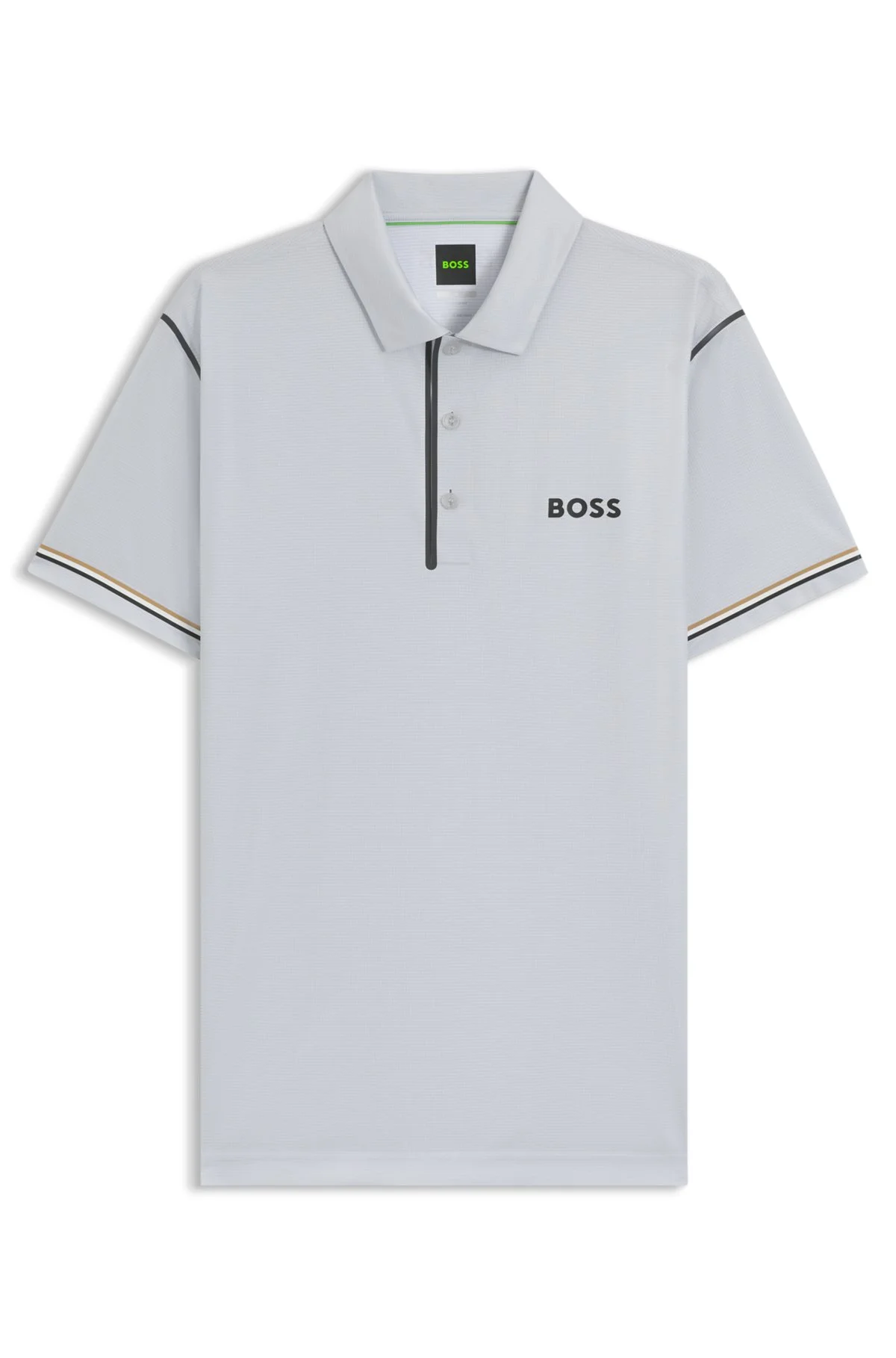 SIZE AND FIT The model wears a size M and is 6'2" tall with a, 38" chest, 31" waist and 38" hips. DETAILS Paddytech GOC - 50543352 Engineered in stretch ripstop with quick-dry performance, this moisture-managing BOSS Menswear polo shirt has a casual fit. Bonded contrast stripes. Regular fit Neckline: Polo collar Number of buttons: 3 Short sleeves Standard length QUALITY & CARE INSTRUCTIONS Iron Low Heat Quality: 100% Polyester Do Not Tumble Dry Machine Wash Cold Gentle Do Not Dry Clean Do Not Bleach