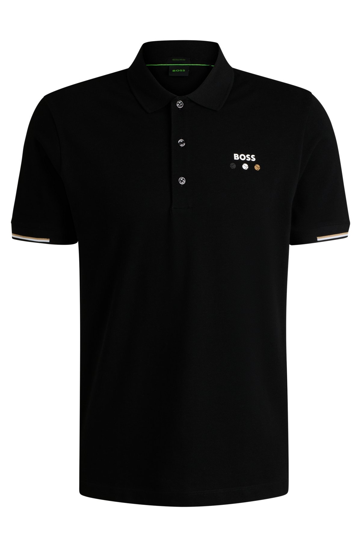 SIZE AND FIT The model wears a size M and is 6'1" tall with a, 38" chest, 29" waist and 37" hips. DETAILS Paddy BOSS Open 25 - 50545707 Featuring signature-stripe trims, grid accents and tennis graphics, this BOSS Menswear polo shirt makes a modern sporty statement. Extra-soft cotton pique. Regular fit. Part of a limited-edition capsule celebrating the BOSS Open tennis tournament. Regular fit Neckline: Polo collar Number of buttons: 3 Short sleeves Flat-knit cuffs Standard length QUALITY & CARE INSTRUCTIONS Machine Wash Cold Gentle Do Not Tumble Dry Quality: 100% Cotton Do Not Bleach Do Not Dry Clean Iron Low Heat