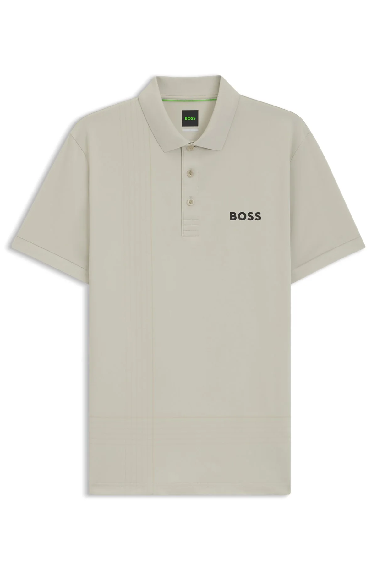 DETAILS Polo Check TOC - 50545692 With clean check artwork, this slim BOSS Menswear polo shirt offers advanced performance and comfort on active days. In super-stretch jersey with moisture management. Slim fit Neckline: Flat-knit collar Number of buttons: 3 Short sleeves Flat-knit cuffs Standard length QUALITY & CARE INSTRUCTIONS Do Not Bleach Do Not Tumble Dry Do Not Dry Clean Iron Low Heat Quality: 92% Polyester, 8% Elastane Machine Wash Cold Gentle