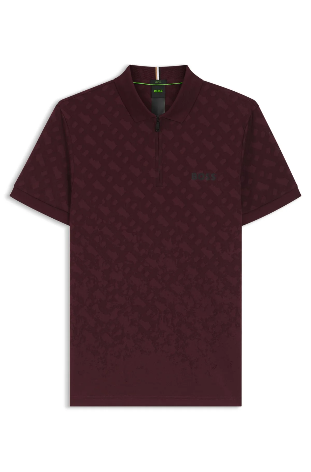SIZE AND FIT The model wears a size M and is 6'2" tall with a, 36" chest, 31" waist and 38" hips. DETAILS Philix TOC JQ - 50538106 With four-way stretch and moisture management, this slim-fit BOSS Menswear polo offers advanced performance and lasting freshness. Clean zip placket. Tonal monogram jacquard. Slim fit Neckline: Flat-knit collar Short sleeves Flat-knit cuffs Standard length QUALITY & CARE INSTRUCTIONS Machine Wash Cold Gentle Quality: 100% Polyester (75% recycled) Iron Low Heat Do Not Dry Clean Do Not Tumble Dry Do Not Bleach