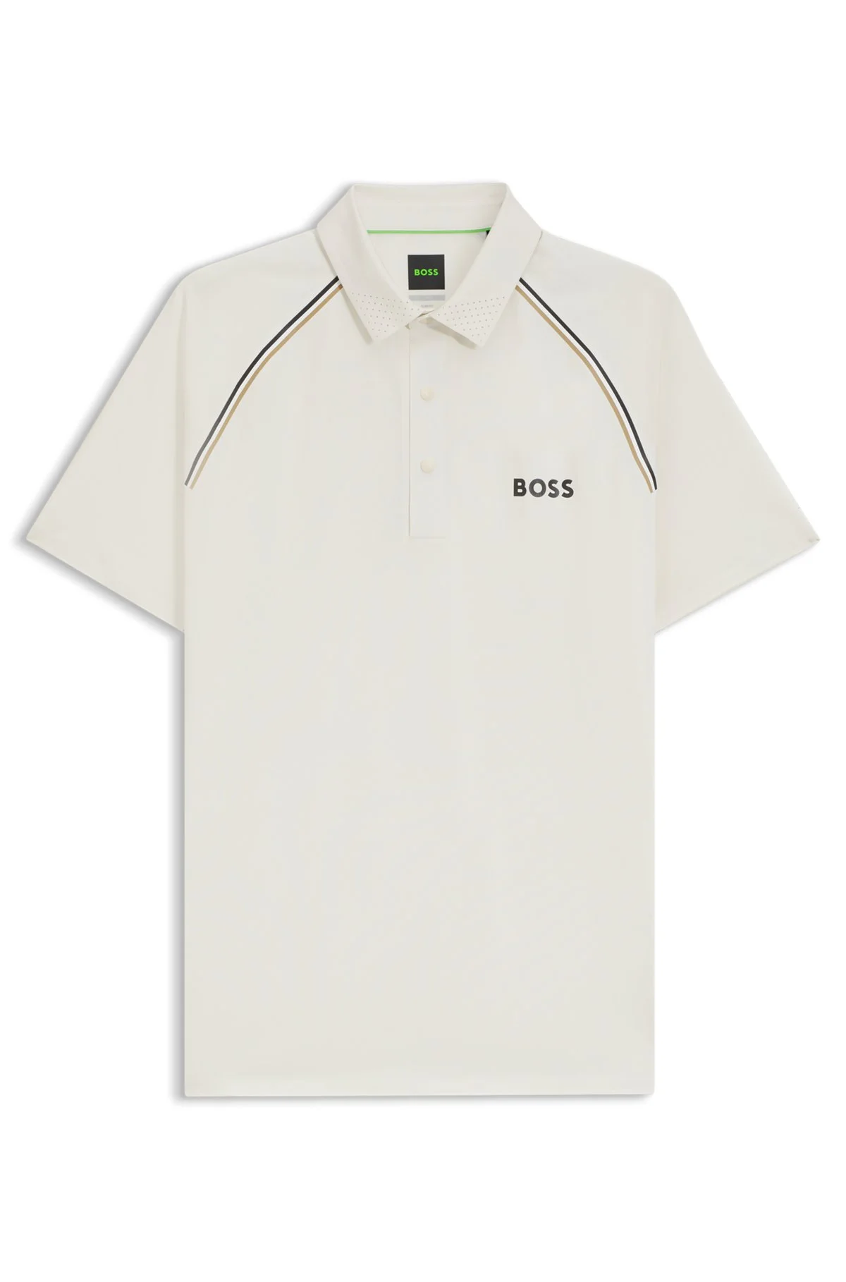 SIZE AND FIT The model wears a size M and is 6'2" tall with a, 36" chest, 31" waist and 38" hips. DETAILS With signature stripes and branding, this quick-drying BOSS Menswear polo shirt provides reliable moisture management. Slim fit Perforated collar detail. Bonded seams for comfort. Slim fit Neckline: Polo collar Number of buttons: 3 Short sleeves Standard length Patteo TOC - 50543333 QUALITY & CARE INSTRUCTIONS Do Not Tumble Dry Machine Wash Cold Gentle Do Not Dry Clean Material: 93% Polyester, 7% Elastane Iron Low Heat Do Not Bleach
