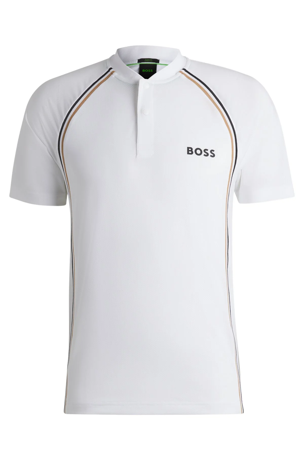 SIZE AND FIT The model wears a size M and is 6'2" tall with a, 36" chest, 31" waist and 38" hips. DETAILS Pariq TOC Mesh - 50538122 A quick-dry option on active days, this BOSS Menswear polo shirt features collarless styling for a clean look. Signature-stripe details. Ideal for tennis. Slim fit Neckline: Flat-knit collar Number of buttons: 2 Short sleeves Standard length QUALITY & CARE INSTRUCTIONS Do Not Dry Clean Do Not Tumble Dry Do Not Bleach Quality: 91% Polyester, 9% Elastane Machine Wash Cold Gentle Iron Low Heat
