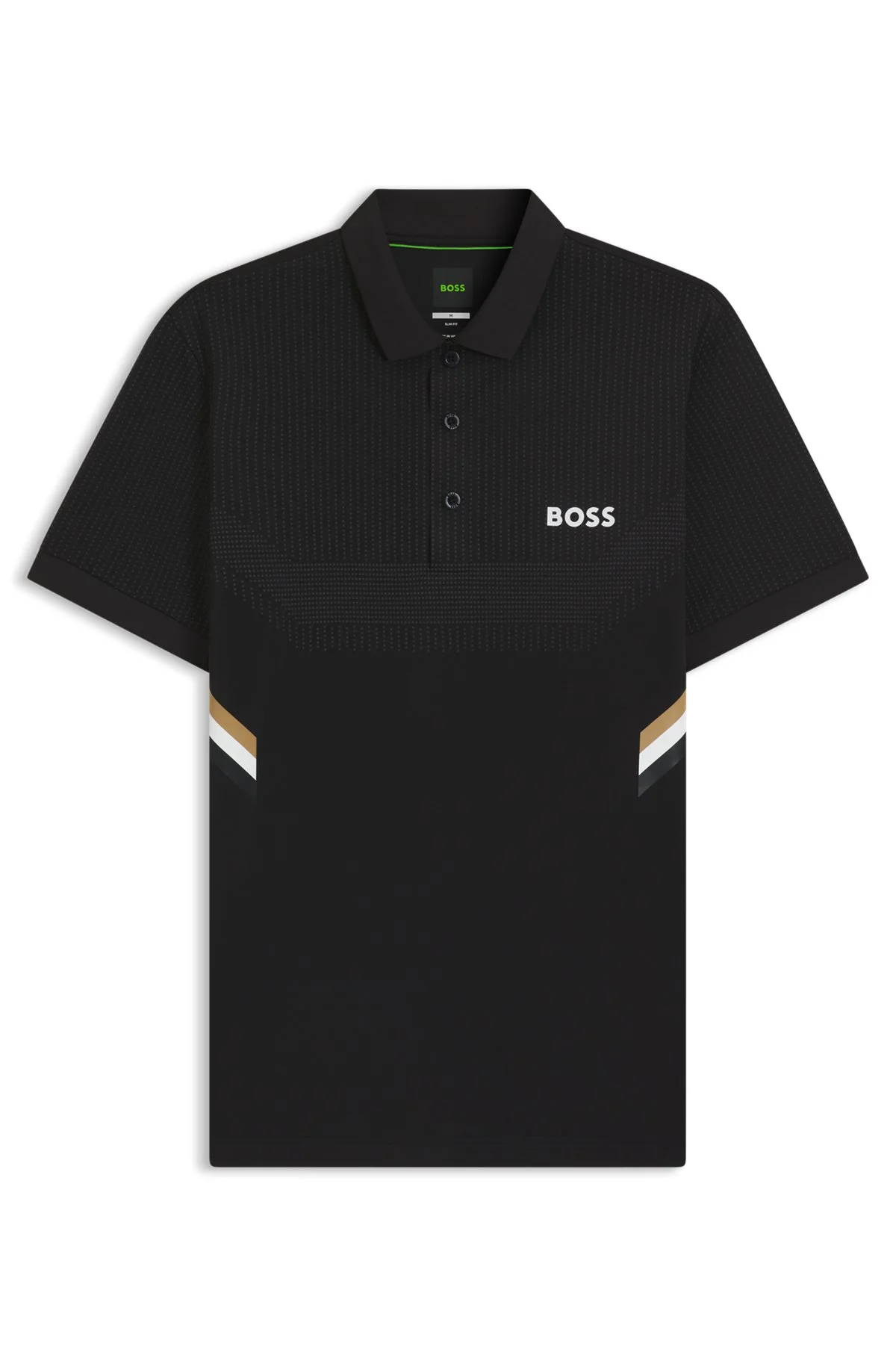 DETAILS Paule TOC - 50543349 In a slim fit, this quick-dry BOSS Menswear polo shirt offers dependable moisture management and odor control. Large logo and printed artwork. UV protection. Slim fit Neckline: Flat-knit collar Number of buttons: 4 or more buttons Short sleeves Flat-knit cuffs Standard length QUALITY & CARE INSTRUCTIONS Do Not Tumble Dry Machine Wash Cold Gentle Iron Low Heat Do Not Bleach Quality: 93% Polyester, 7% Elastane Do Not Dry Clean