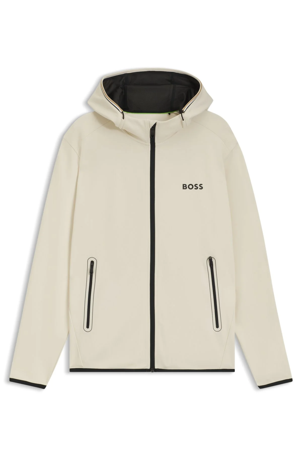SIZE AND FIT The model wears a size M and is 6'0" tall with a, 38" chest, 30" waist and 37" hips. DETAILS Sicon TOC - 50542948 In quick-dry stretch gabardine for durable comfort, this zip-up BOSS Menswear hoodie keeps you comfortable in all conditions. Straight fit. Adjustable hood. Regular fit Neckline: Hooded Fastening top: Zip closure Pockets top: Zip pockets Long sleeves Elasticized cuffs Standard length QUALITY & CARE INSTRUCTIONS Do Not Tumble Dry Machine Wash Cold Gentle Quality: 90% Polyamide, 10% Elastane Iron Low Heat Do Not Bleach Do Not Dry Clean