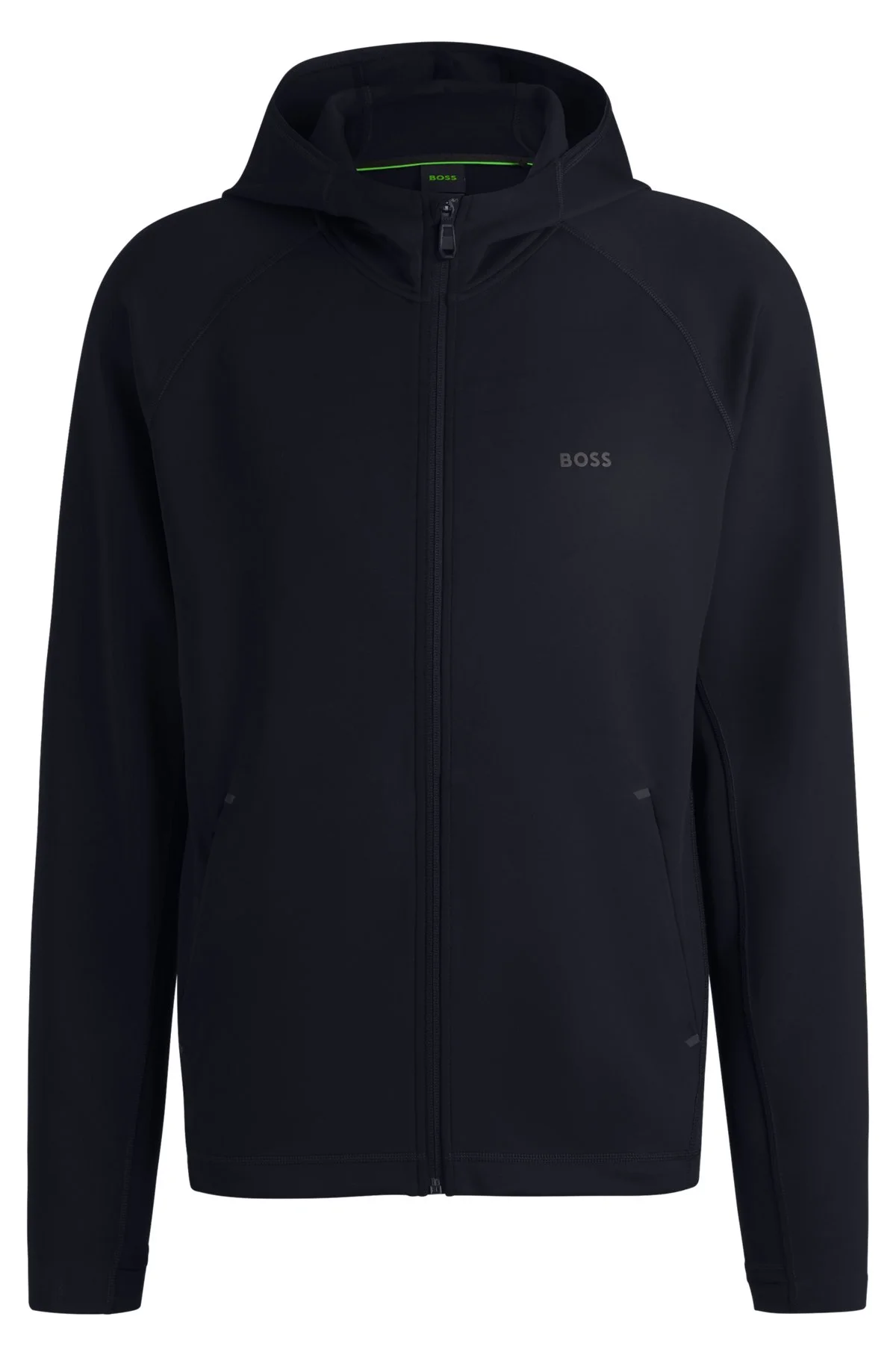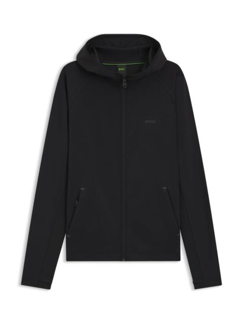 SIZE AND FIT The model wears a size M and is 6'2" tall with a, 38" chest, 31" waist and 37" hips. DETAILS Sicon Active - 50531224 Trimmed with decorative reflective details, this BOSS Menswear hoodie is a high-performance layer for workouts. Shaped hood. Secure zipped pocket. Easy regular fit. Regular fit Neckline: Hooded Fastening top: Zip closure Pockets top: Side-entry pockets Long sleeves Standard length QUALITY & CARE INSTRUCTIONS Iron Low Heat Machine Wash Cold Gentle Quality: 92% Polyester, 8% Elastane Do Not Bleach Do Not Tumble Dry Do Not Dry Clean