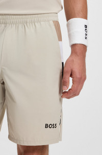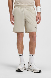 SIZE AND FIT The model wears a size M and is 6'1" tall with a, 38" chest, 31" waist and 37" hips. DETAILS S_T-Match 9 inch - 50541370 Engineered with an athleisure inseam for comfort, these BOSS Menswear tennis shorts feature large mesh pockets. Signature-stripe inserts. Quick-dry fabric. Hidden drawcords. Regular fit Pockets bottom front: French pocket QUALITY & CARE INSTRUCTIONS Machine Wash Cold Gentle Quality: 100% Elastomultiester, pocketing: 100% Polyester Do Not Dry Clean Do Not Tumble Dry Do Not Bleach Iron Low Heat