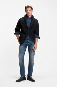SIZE AND FIT The model wears a size M and is 6'2" tall with a, 36" chest, 29" waist and 36" hips. DETAILS Cut to a relaxed fit, this BECKHAM x BOSS cardigan has all the markings of a lasting classic. Rich wool-cashmere blend. Chunky ribbed knit. BECKHAM x BOSS brings effortless style with timeless and elevated statement pieces, inspired by David’s wardrobe. Relaxed fit Neckline: Shawl lapels Long sleeves Standard length Horace_DB - 50554341 QUALITY & CARE INSTRUCTIONS Reduced Dry Clean Do Not Bleach Iron Low Heat Do Not Tumble Dry Cold, gentle machine wash; reduced spin speed. Material: 90% Virgin wool, 10% Cashmere