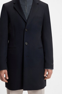 SIZE AND FIT The model wears a size 40R and is 6'2" tall with a, 36" chest, 29" waist and 36" hips. DETAILS Elegant and understated, in a super-soft wool-cashmere blend, this BECKHAM x BOSS men's coat is ideal over sharp tailoring. Light wadding. Slim fit. BECKHAM x BOSS brings effortless style with timeless and elevated statement pieces, inspired by David’s wardrobe. Slim fit Notched lapels Number of buttons: 3 Welt chest pockets Pockets top: Welt pockets Kissing buttons on the cuff No vent Fully lined SB-Coat-254_DB - 50554924 QUALITY & CARE INSTRUCTIONS Reduced Dry Clean Do Not Bleach Iron Low Heat Do Not Tumble Dry Material: 90% Virgin wool, 10% Cashmere, Sleeve lining: 100% Viscose, Wadding: 20% Polyester, 60% Viscose, 20% Polyacrylic, Body Lining: 100% Viscose Do Not Wash