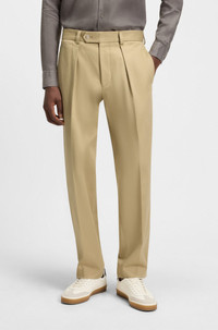 SIZE AND FIT The model wears a size 32R and is 6'2" tall with a, 37" chest, 33" waist and 35" hips. DETAILS Trousers-252_DB - 50549203 Blended with stretch for comfort, these BECKHAM x BOSS men's trousers will go with almost anything. Rich in soft, breathable cotton. BECKHAM x BOSS brings effortless style with timeless and elevated statement pieces, inspired by David’s wardrobe. Slim fit Button and zip closure Pleat front Pockets bottom front: Side slash pockets Pockets bottom back: Welt pocket Partially lined QUALITY & CARE INSTRUCTIONS Reduced Dry Clean Quality: 98% Cotton, 2% Elastane, pocketing: 100% Cotton Do Not Bleach Iron Medium Heat Do Not Wash Do Not Tumble Dry