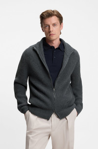 SIZE AND FIT The model wears a size M and is 6'2" tall with a, 36" chest, 29" waist and 36" hips. DETAILS Layer in luxury with the soft rib and wool-cashmere blend of this relaxed BECKHAM x BOSS cardigan. Two-way front zip. BECKHAM x BOSS brings effortless style with timeless and elevated statement pieces, inspired by David’s wardrobe. Relaxed fit Neckline: Stand collar Long sleeves Standard length Hilustre_DB - 50554340 QUALITY & CARE INSTRUCTIONS Reduced Dry Clean Do Not Bleach Iron Low Heat Do Not Tumble Dry Cold, gentle machine wash; reduced spin speed. Material: 90% Virgin wool, 10% Cashmere