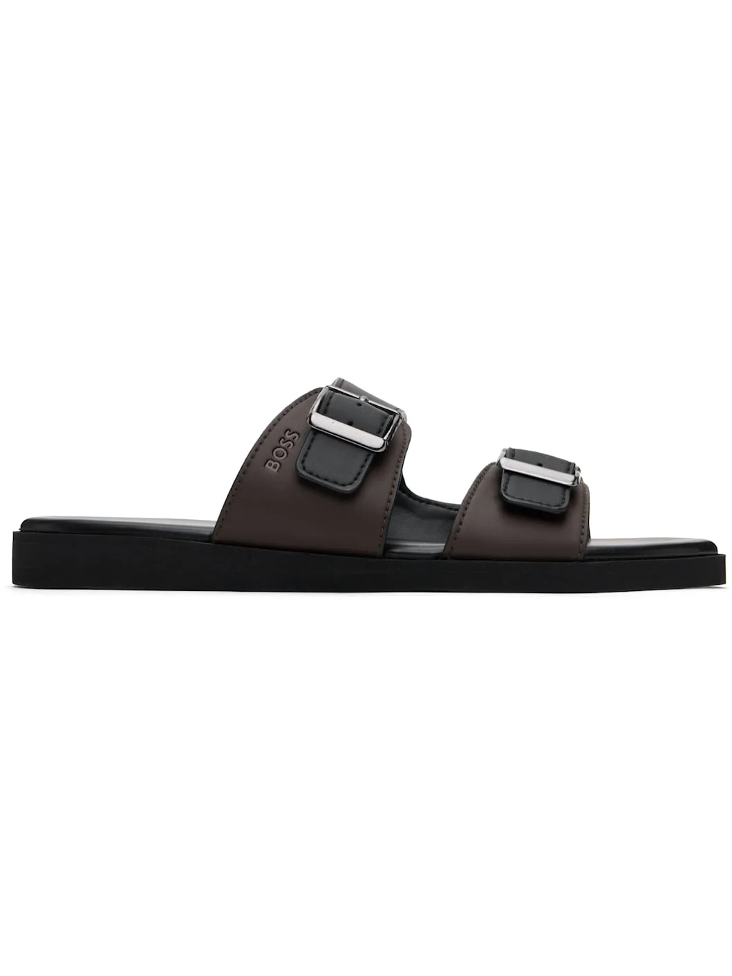 Buffed faux-leather slip-on sandals in black and brown. · Open toe · Adjustable pin-buckle straps at vamp · Logo embossed at outer side · Buffed faux-leather lining · Logo printed at padded faux-leather footbed · Foam rubber midsole · Treaded rubber sole Supplier color: Black Upper: synthetic. Sole: rubber. Made in Lao Peoples Republic 251085M234012