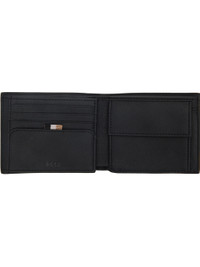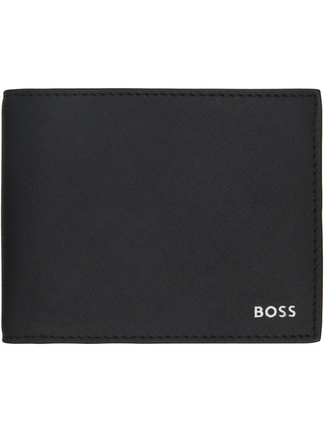 Saffiano leather trifold wallet in black. · Logo stamp at face · Two patch pockets at interior · Mesh ID slot and eight card slots · Coin compartment and two note slots · Twill lining · H3.5" x W4.5" x D1" Supplier color: Black Leather. Made in India 252085M164006
