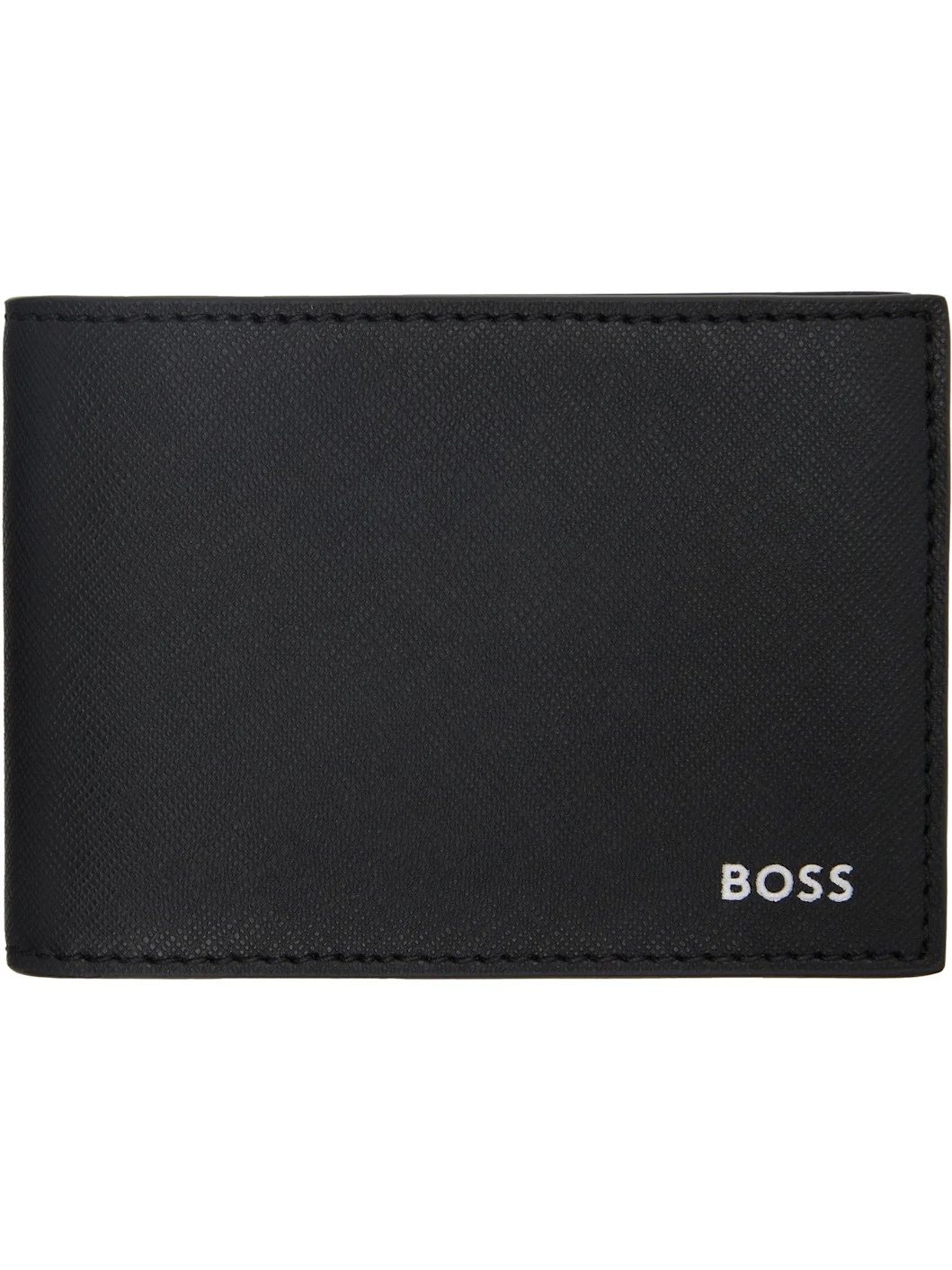 Saffiano leather bifold wallet in black. · Logo stamp at face · Two patch pockets at interior · Six card slots and two note slots · Twill lining · H3" x W4.25" x D1" Supplier color: Black Leather. Made in India 252085M164004
