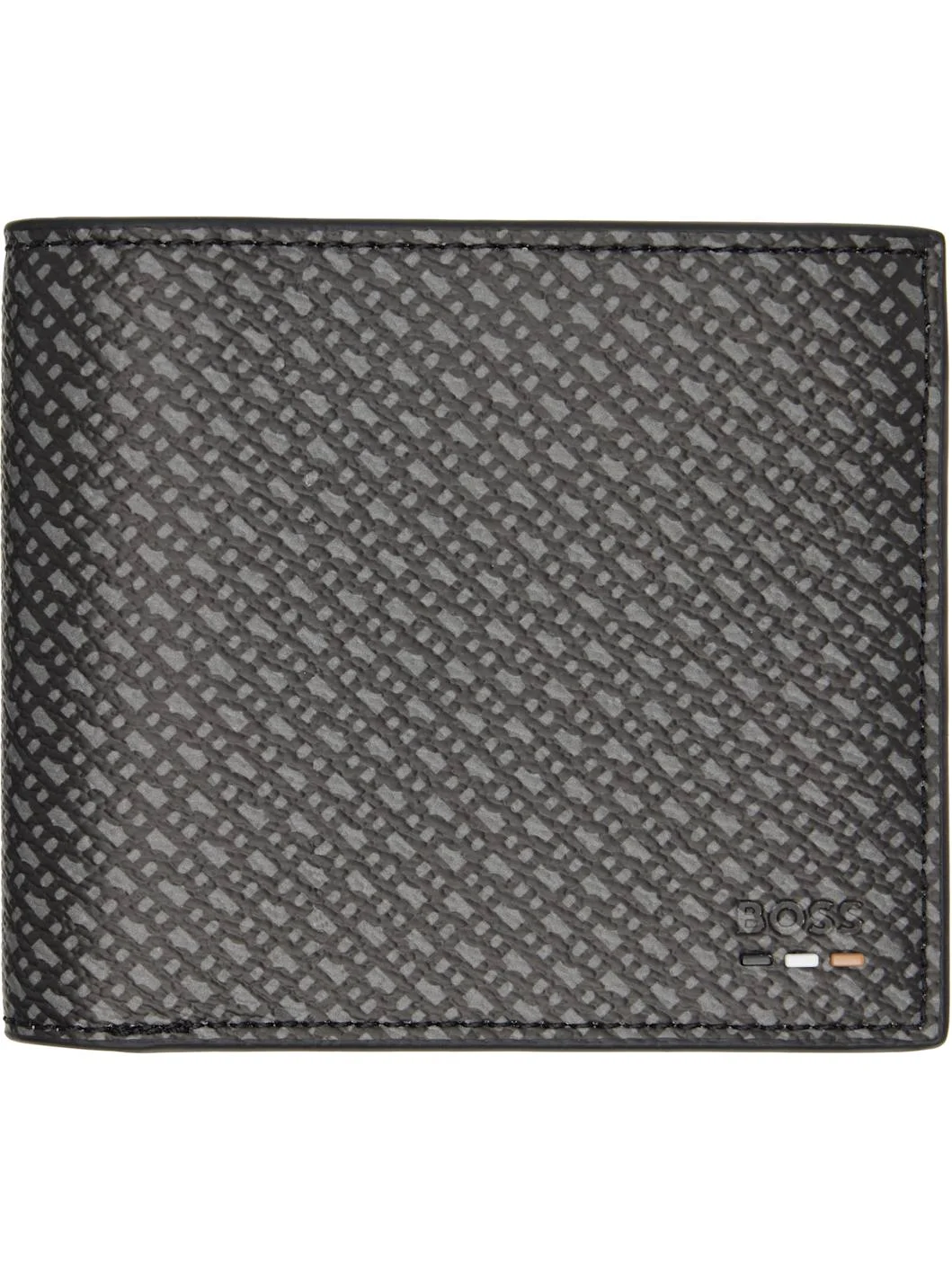 Grained faux-leather bifold wallet. · Graphic pattern printed throughout · Embossed logo and tricolor logo hardware at face · Eight card slots · Two patch pockets · Two note slots · Buffed faux-leather interior · Twill and moire lining · H3.75" x W4.5" x D1" Supplier color: Black Body: 60% recycled polyester, 20% polyurethane, 20% recycled polyurethane. Trim: 62% recycled polyurethane, 30% polyester, 8% polyurethane. Lining: 100% polyester. Made in Cambodia 261085M164018